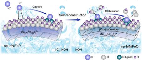 针对上述关键问题,谭勇文教授团队利用纳米多孔金属磷化物在析氧反应中的表面自重建的现象,制备了一种兼具高催化活性和电化学稳定性的析氧单原子铱催化剂。在该制备策略中,纳米多孔金属磷化物的表面会在活化的过程中进行自重建形成氢氧化物或羟基氧化物,其丰富的氧配体能够进一步稳定孤立的铱原子(图一)。由于析氧反应中催化剂表面自重建的现象很普遍,这种自重建的策略有望为单原子催化剂的设计和制备提供一种新的思路。