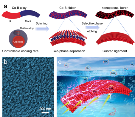 基于上述关键问题,谭勇文教授团队与约翰霍普金斯大学陈明伟教授合作,使用一种简单,通用且可扩展的冶金合金设计结合选择性相刻蚀法成功制备了三维双连续纳米多孔硼。在该制备策略中,以钴硼合金作为前驱体进行选择性刻蚀硼化钴相即可获得三维纳米多孔硼(图三)。同时,通过控制硼化钴相的尺寸和体积分数可以有效地调节纳米多孔硼的孔径和孔隙率。这项工作为纳米多孔非金属的制造提供了全新的合成策略,将极大地丰富脱合金纳米多孔材料体系。该论文以内封面文章的形式发表在国际知名材料类期刊《Materials Today》(IF=24.37)上,课题组硕士研究生蓝蛟为该论文的第一作者。